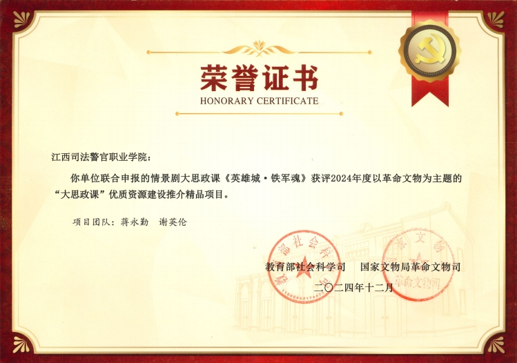 近日,国家文物局办公室、教育部办公厅联合公布了2024年度以革命文物为主题的“大思政课”优质资源建设推介项目结果。江西司法警官职业学院与南昌新四军军部旧址陈列馆联合申报的情景剧大思政课《英雄城・铁军魂》成功获评精品项目(校园文化类)。 江西司法警官职业学院整合多方资源,强化校馆合作,组建了一支由陈列馆专业讲解员、学院骨干教师以及学生代表构成的教学创新团队。团队依托南昌新四军军部旧址陈列馆丰富的红色资源,围绕思政课统编教材内容,以“问题式专题化团队教学改革”为主抓手和总牵引,组建“铁军”合唱团,将艺术元素融入“大思政课”建设中,通过舞台展演方式,开发了情景剧大思政课《英雄城·铁军魂》,实现音乐元素与思政教育的深度融合,学生在“行走的思政课”中受教育、长才干、作贡献。通过精心编排的情景剧表演,生动展现了新四军在南昌集结,英勇奔赴抗日前线的历史。