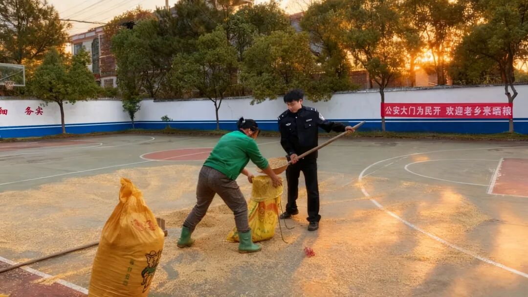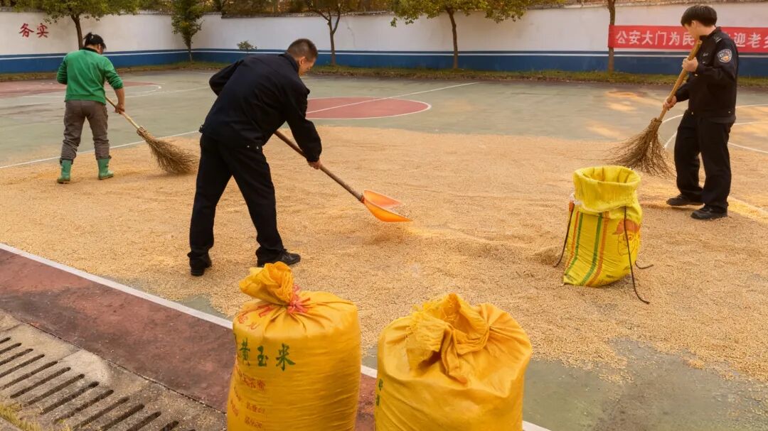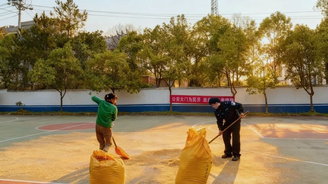 “派出所这个院子 现在可是我们镇的黄金晒场!” 正翻晒稻谷的王大姐笑着说 “地方宽敞又安全 民警同志还帮忙照看 我们再也不用担心粮食被偷或者被车轧了” 晒粮间隙 民警还会给等候的村民递上茶水 顺便开展防火防盗宣传 这个秋天的派出所大院 既是晒场,也成了警民连心桥