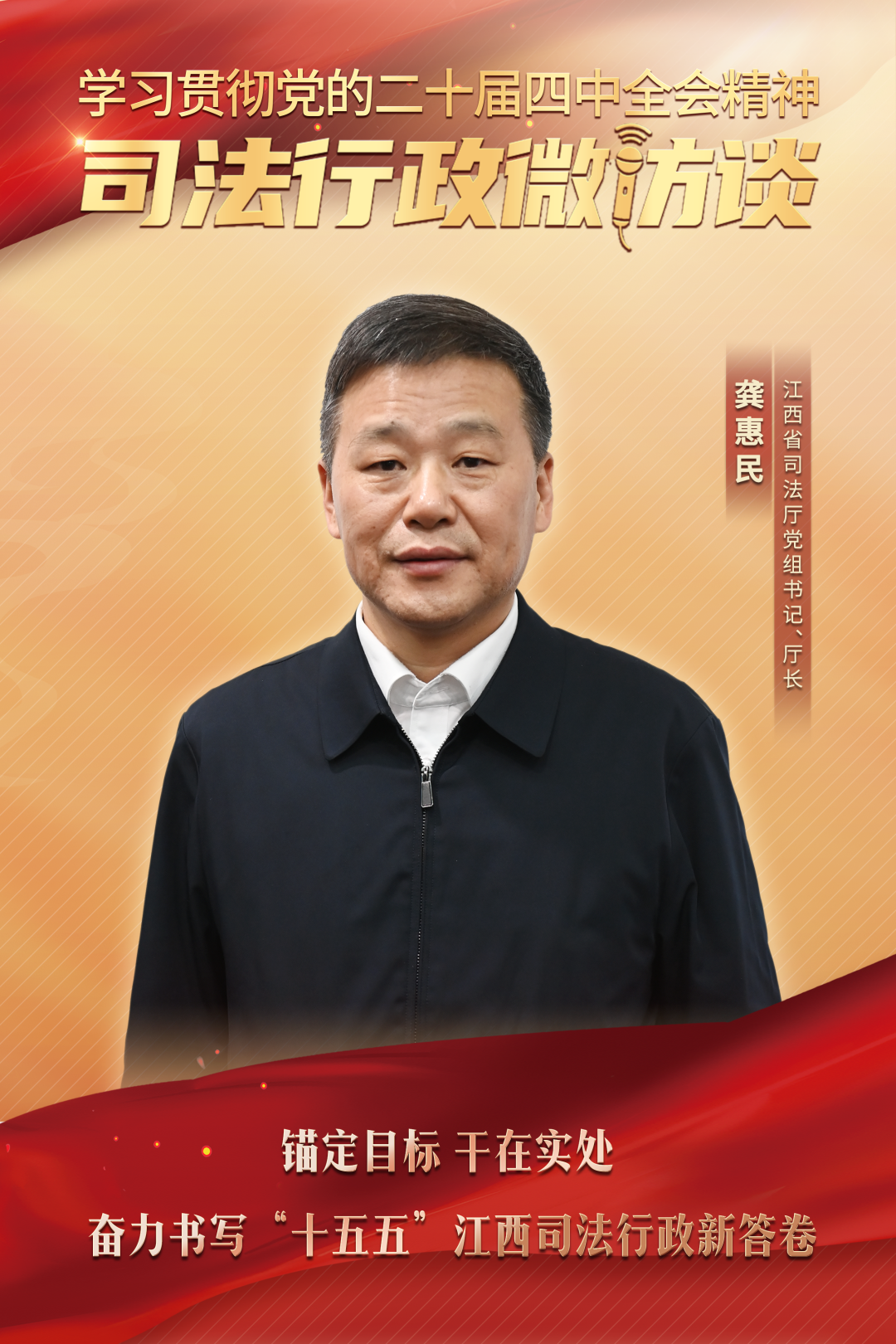 编者按 为做好党的二十届四中全会精神学习宣传贯彻工作,及时反映司法行政系统学习贯彻全会精神、推进工作发展的体会收获和具体举措,形成学习贯彻的良好氛围,司法部策划推出“学习贯彻党的二十届四中全会精神——司法行政微访谈”节目,今天邀请到的访谈嘉宾是江西省司法厅党组书记、厅长龚惠民。